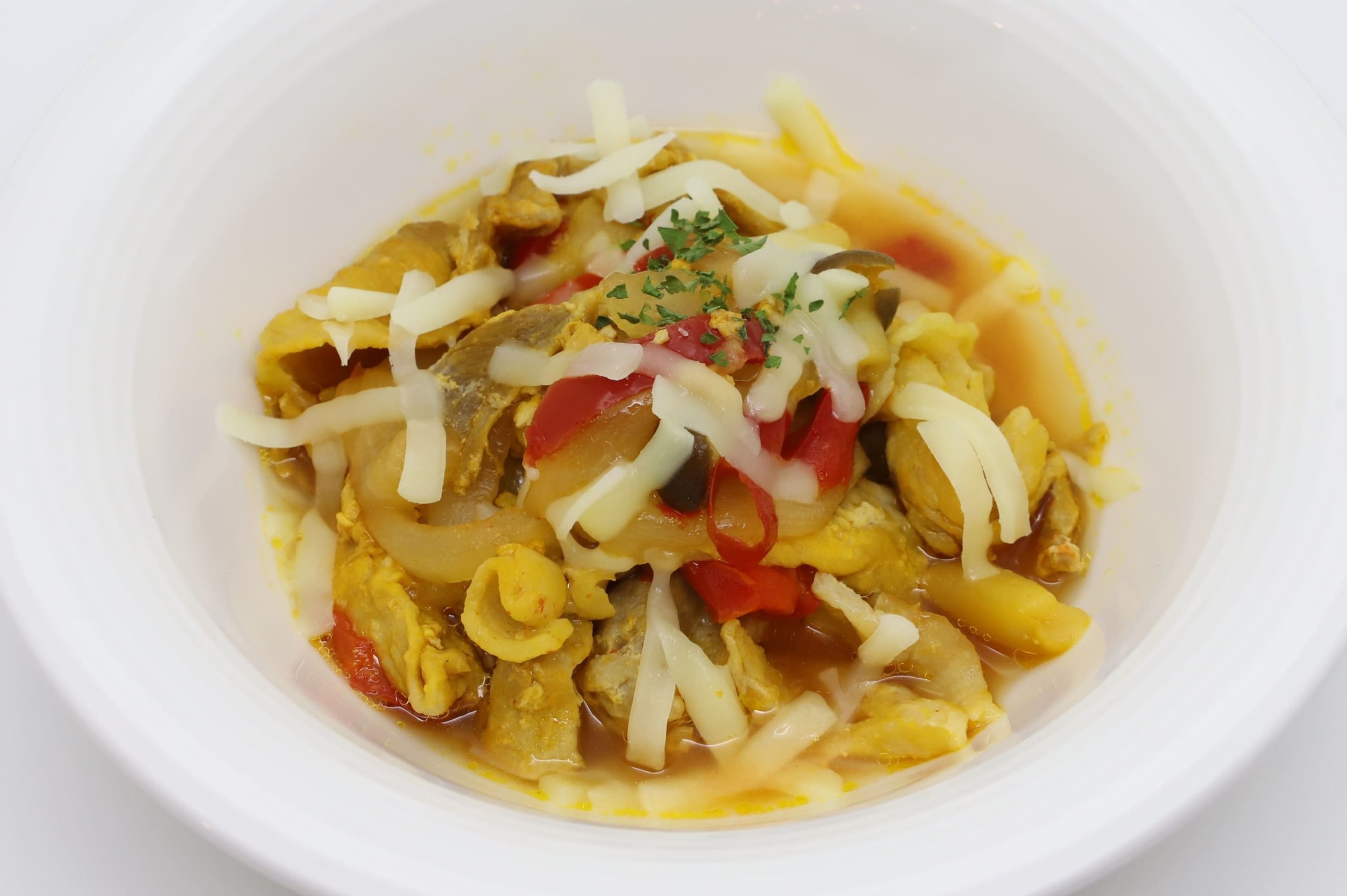 「味の素KKやわらかしっとり調理料(速効タイプ)」を使って、豚肉をしっとりと食べやすく、「クノール® クッキングスープ」トマトコンソメで、濃厚な味わいの本格的なトマト煮込みに仕上げます。赤ピーマンスライスを入れることで、より赤色が際立ちます。