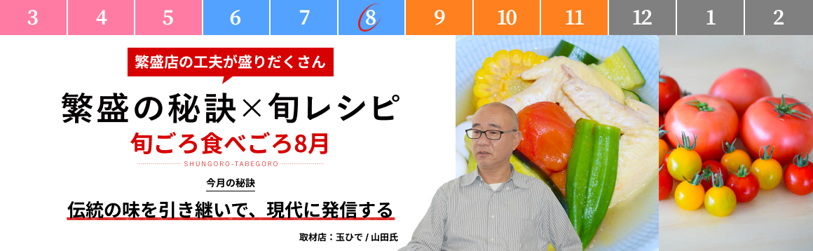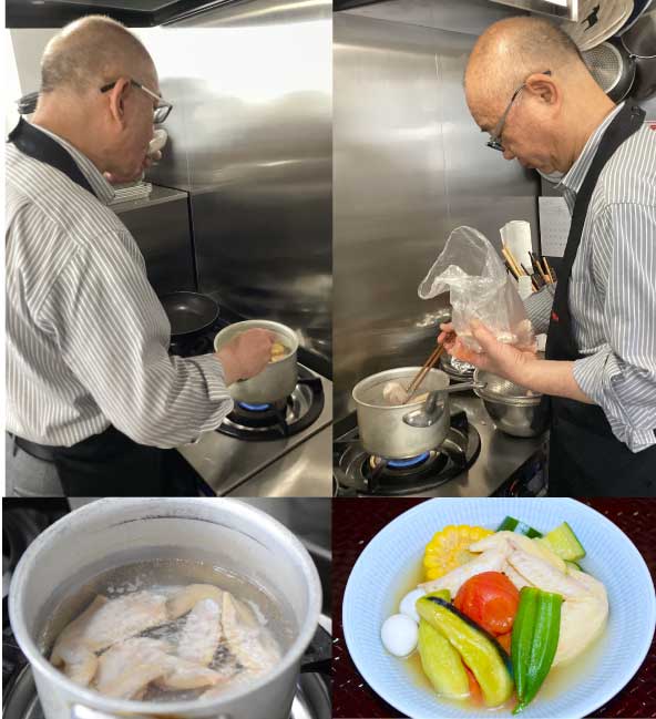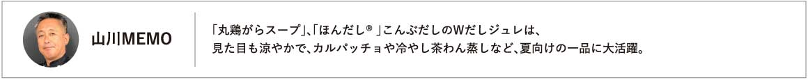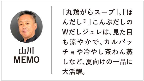 山田氏:手羽先を使って、夏向けの冷やしおでんにしました。手羽には、味の素㈱の「丸鶏がらスープ」で下味を付けています。その手羽をゆでるか、焼くかで味が変わってきます。今日は、手羽先をゆでます。最初のゆで汁は、余分な脂があるので捨てると臭みのないスープになります。味付けは「丸鶏がらスープ」のみ。トマトは湯むき、なすは浅漬けの水なすです。その他の食材もスーパーで手軽に手に入るものを使って今回は作りました。野菜の色が飛びやすい物は煮過ぎないこと。冷やすことで味が染込むので、そのまま粗熱が取れるまで置いて、それから冷蔵庫に移して、冷やしてください。他のトマト料理は、煮込みなどもあるけど、トマトをミキサーにかけて濾して、色素を取り除いた透明なのにトマトの味がするスープが好きなんですよ。でもやはりトマトはそのままの冷やしトマトが一番ですかね。