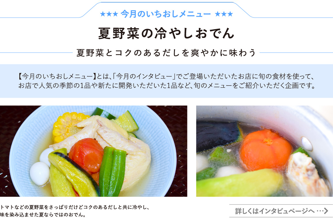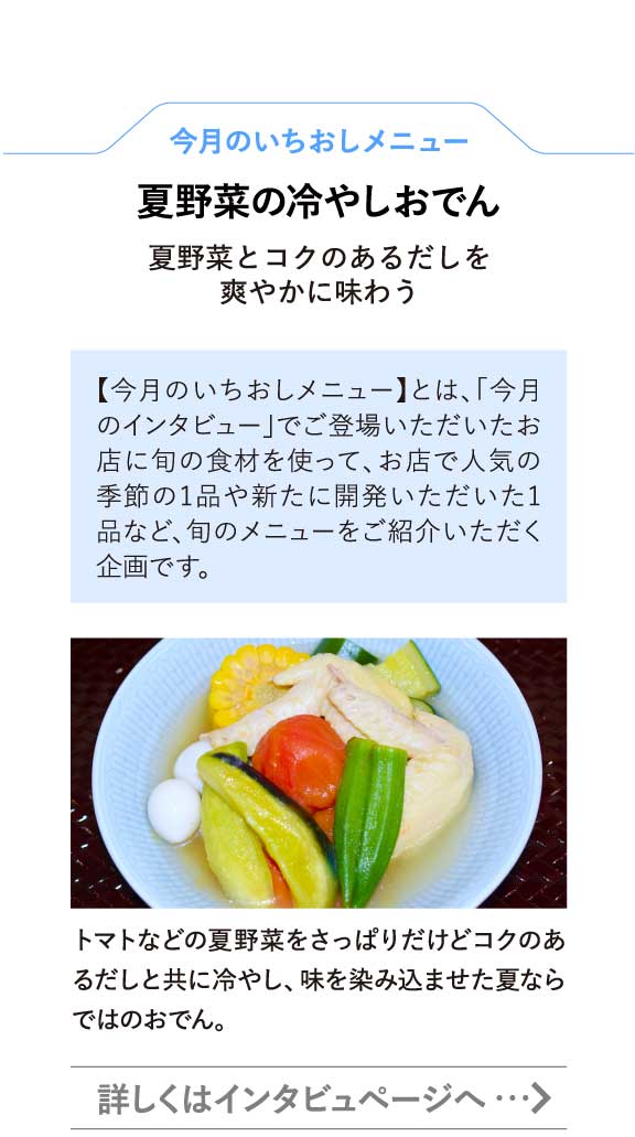 写真)夏野菜の冷やしおでん/トマトなどの夏野菜をさっぱりだけどコクのあるだしと共に冷やし、味を染み込ませた夏ならではのおでん