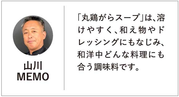 山川:食材などの情報はどこから得ていますか?調味料はどんなをお使いですか、また今回「丸鶏がらスープ」を使っていただいたご感想やあったら使ってみたい調味料など教えてください。