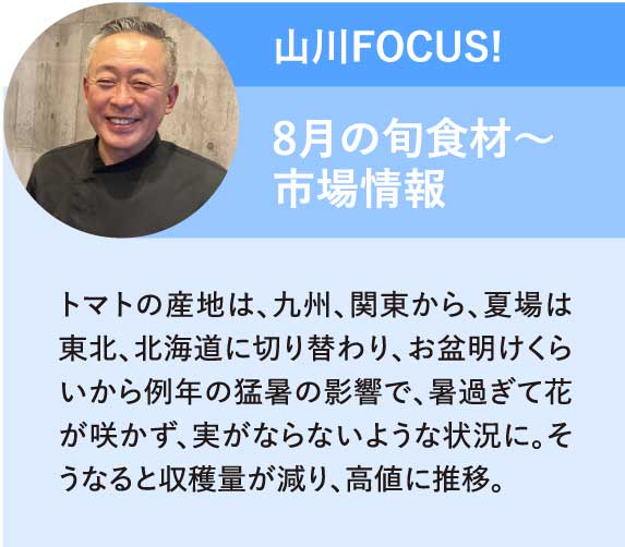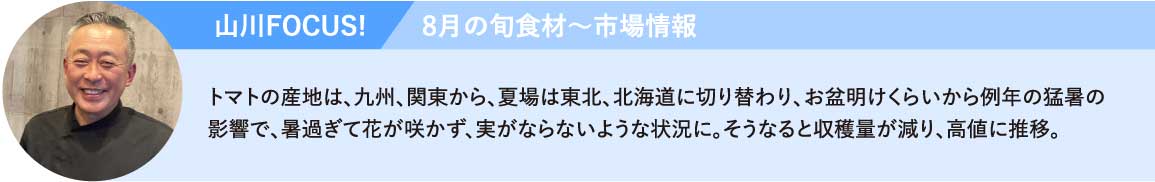 山川シェフオリジナルの 「鶏だしジュレトマト」 「ビーフステーキ フレッシュトマトソース」 をご紹介