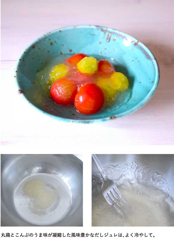 よく冷やしたにこごり風の鶏だしジュレをトマトと一緒に