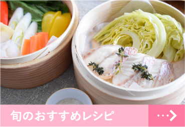 ②蒸籠にオーブペーパーをしき、B・鯛を並べたら、①を適量かけ、タイムをのせ、別の蒸籠にCを並べて、①を適量かけ、重ねて蒸す。