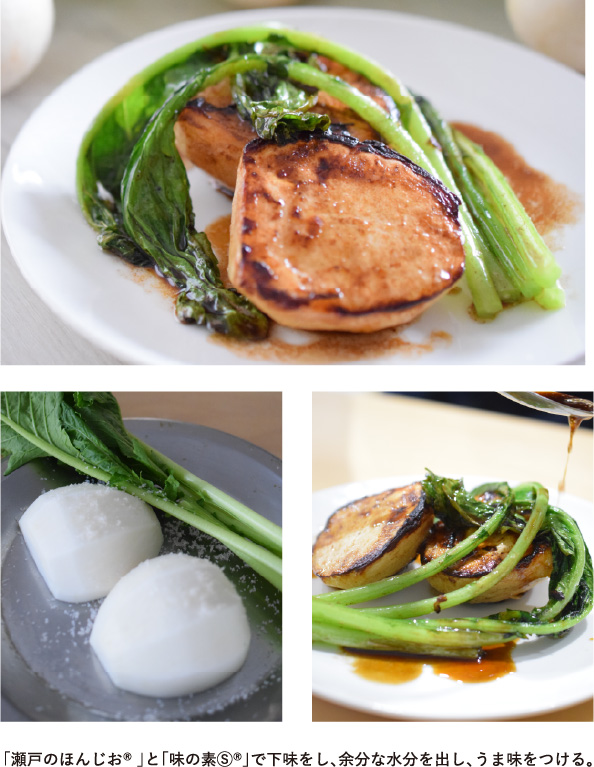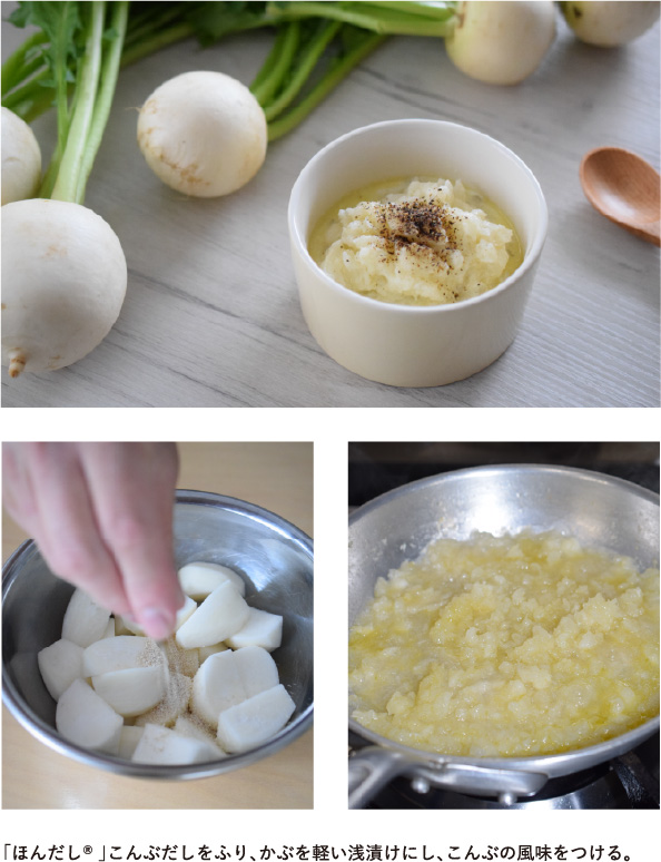 ①かぶに「ほんだし® 」こんぶだしをふり、しばらく置く。