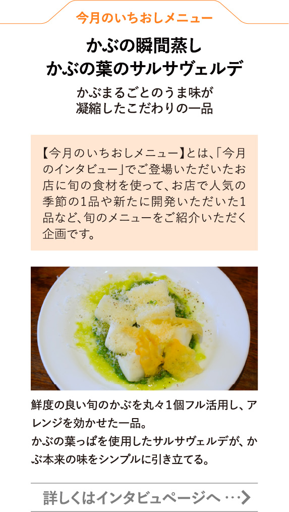 岩井氏:葉っぱが付いたいいかぶが入ったので、瞬間蒸しにしました。ルッコラとかバジリコとかで作るサルサヴェルデという緑のソースがあるのですが、今回はかぶの葉っぱを使って作ってみました。他にかぶは、スープにしたり、炭火で焼いたりしています。かぶは、メインというより、肉や魚の付け合わせに使うことが多いですね。旬の食材そのものの味、美味しさを知って欲しいなと思っていて、季節感は大事にしています。食材に対してあんまり複雑に味を入れたくないんです。シンプルなものを目指してやっています。でも、それをやるにはやっぱり、材料が良くないと成立しないので、鮮度がいいもの、旬のものは意識しています。