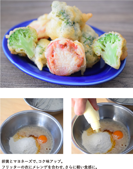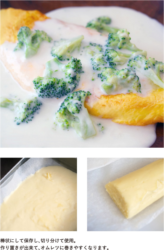 ④フライパンにバターを入れて火にかけ、③を流し入れて半熟状にし、①を50g入れ、オムレツにする。