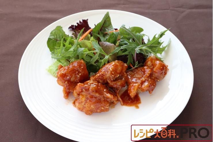 ぶつ切り鶏のから揚げ、トマトサルサソース添え