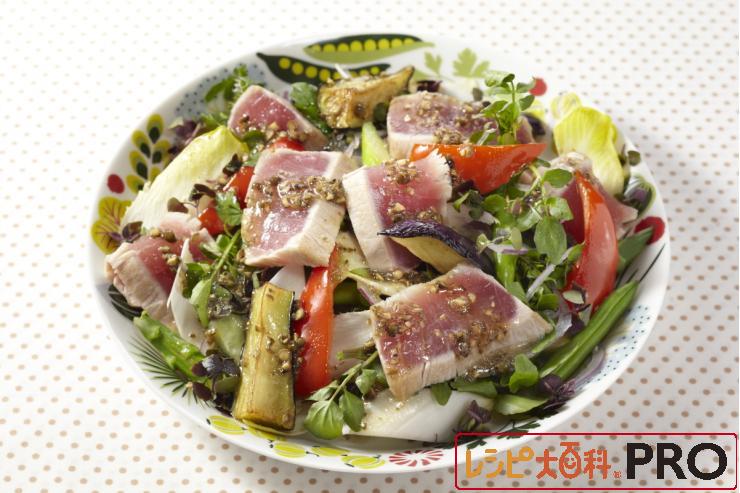 マグロとたっぷり野菜のサラダ、青こしょうドレッシング