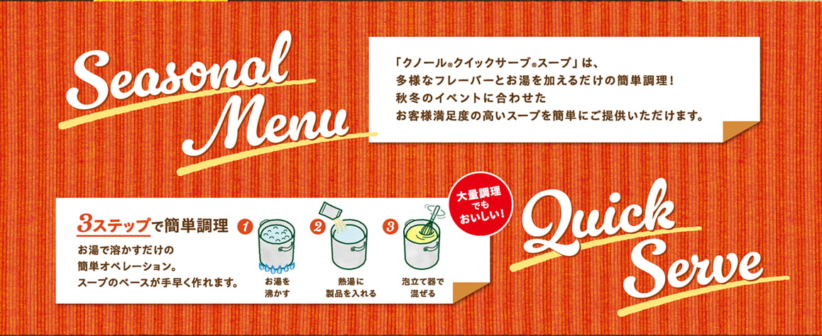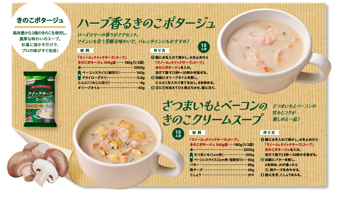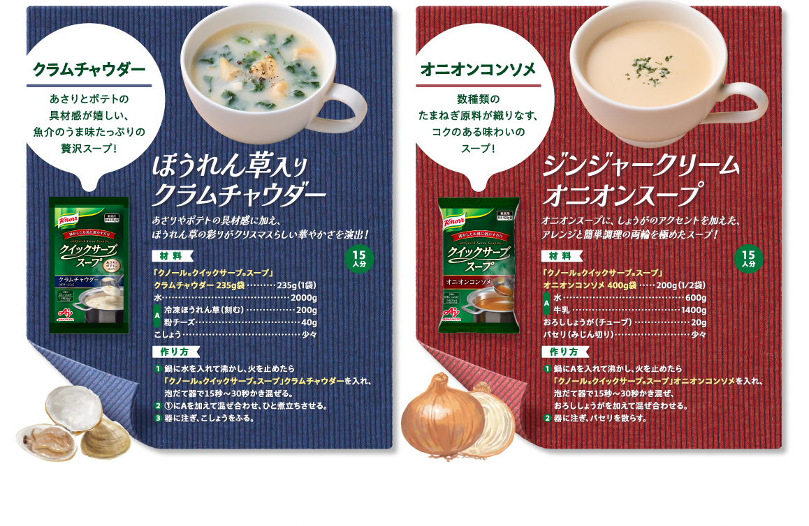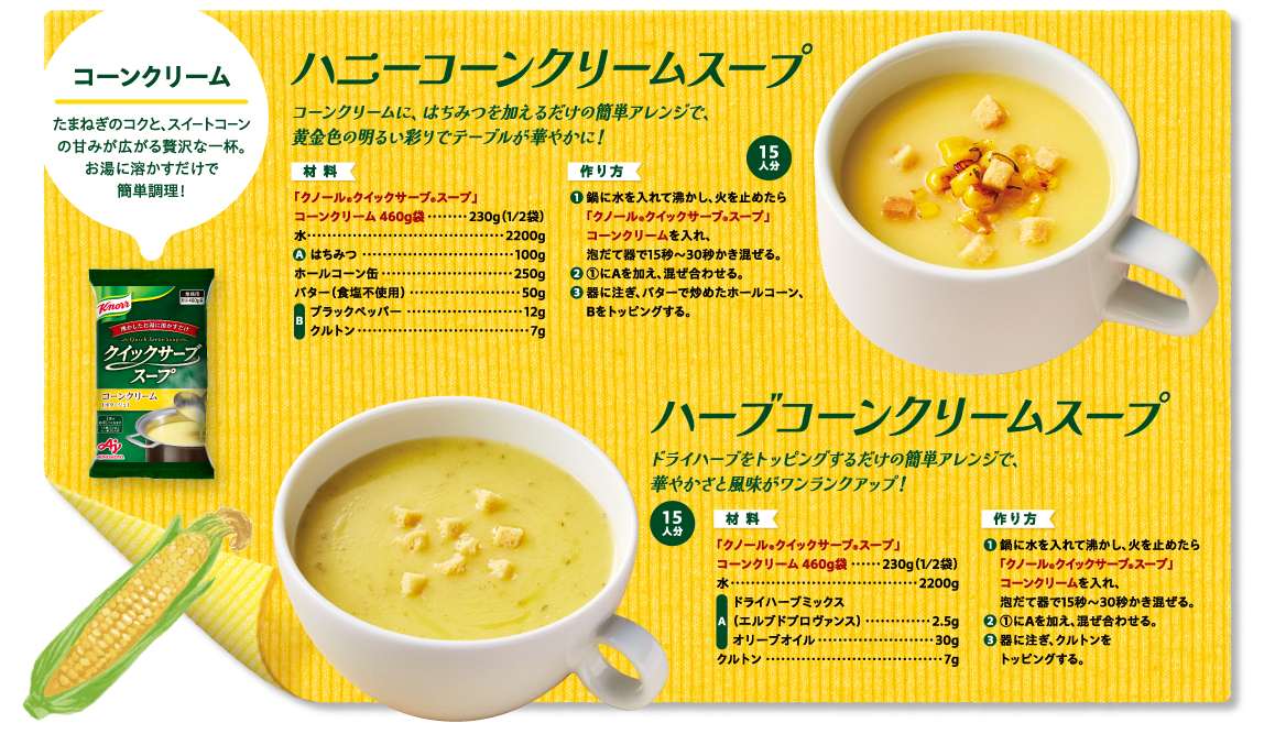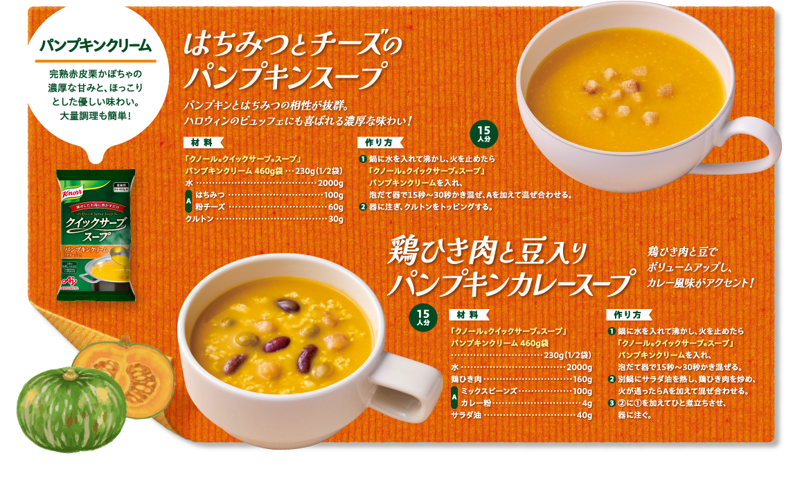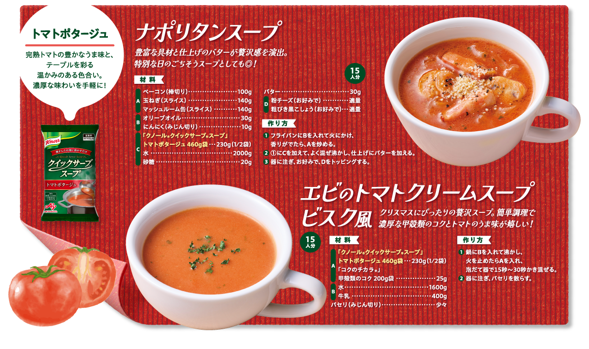 このページは約2分で読めます。 「クノール®クイックサープ®スープ」 コーンクリーム [ポタージュ] 460g袋 荷姿:460g袋×20 「クノール®クイックサープ®スープ」 ポタージュ 420g袋 荷姿:420g袋×20 「クノール®クイックサープ®スープ」 トマトポタージュ 460g袋 荷姿:460g袋×20 「クノール®クイックサープ®スープ」 緑黄色野菜 [ポタージュ] 460g袋 荷姿:460g袋×20 「クノール®クイックサープ®スープ」 パンプキンクリーム [ポタージュ] 460g袋 荷姿:460g袋×20 「クノール®クイックサープ®スープ」 オニオンコンソメ 400g袋 荷姿:400g袋×20 「クノール®クイックサープ®スープ」 きのこポタージュ 360g袋 荷姿:360g袋×20 「クノール®クイックサープ®スープ」 クラムチャウダー[ポタージュ] 235g袋 荷姿:235g袋×20 前の特集