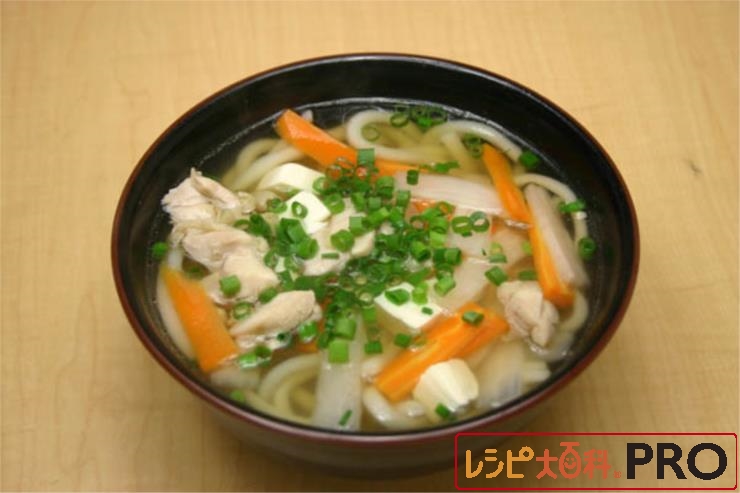 器にうどんを盛り、(1)の残りを注ぎ、(2)と豆腐をのせ、小ねぎを散らす。