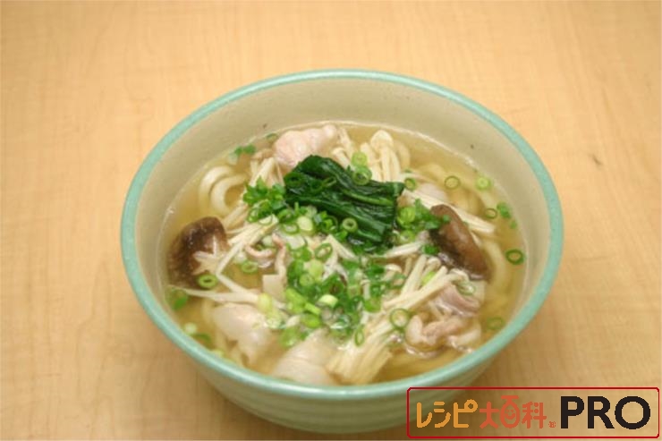 器にうどんを盛り、(2)を注ぎ、(1)、ほうれん草をのせ小ねぎを散らす。