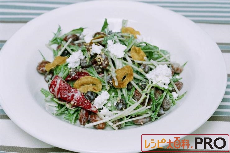 (3)を器に盛りつけ、カッテ-ジチーズ、にんにくチップ、白ごまをのせる。