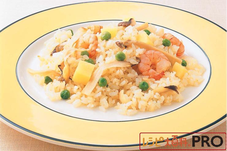 フライパンにサラダ油を熱し、バターを入れAを炒め、白ワインを加えアルコールを飛ばし、ご飯を加え、さらに炒める。