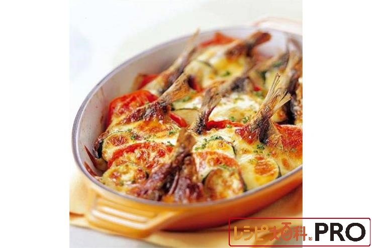 耐熱皿にトマト、ズッキーニ、(2)を順に並べ、ボウルに合わせたAをかけ、オーブントースターで、こんがり焼き、パセリを散らす。