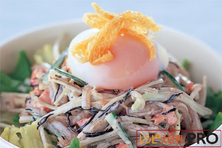 器にレタスを敷き、(1)を盛りつけ、温泉卵、油揚げをのせる。
