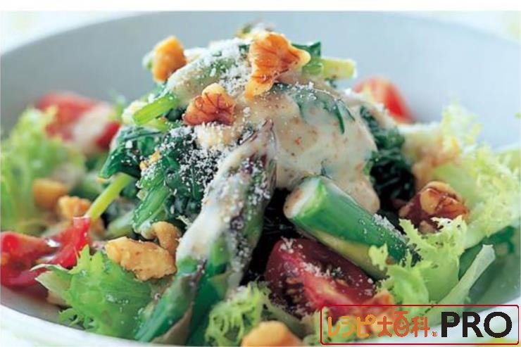 器に(1)を小高く盛り付け、Aを盛り、残りの「ダブル焙煎ごまクリーミードレッシング」をかける。