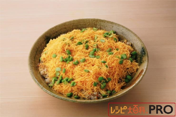 器に炊きあがった(5)を盛り、枝豆と錦糸玉子を散らす。