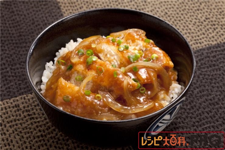 丼にご飯を盛り、(1)をそぎ切りにしてのせ、(2)をかける。
