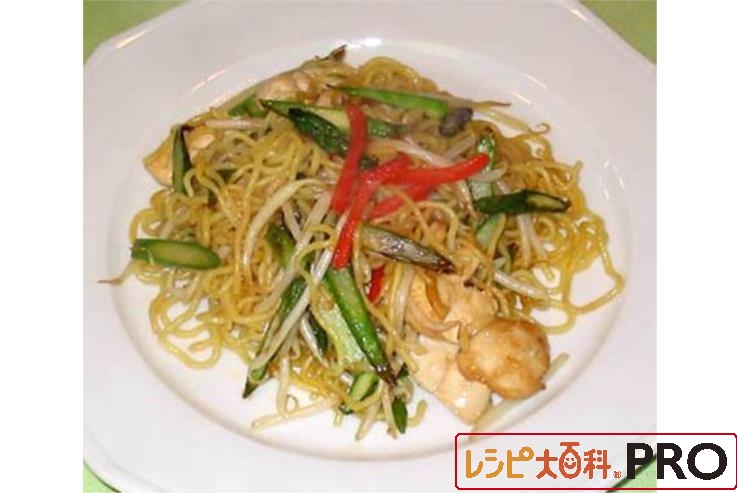 ささ身とグリーンアスパラの塩炒め焼きそば