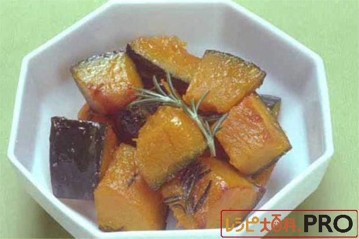(1)の余分な油を捨て、あおり炒めし、かぼちゃがほっくりとしたらAをふって味を調える。※好みでローズマリーを添える。