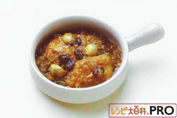バター大さじ1を溶かし、(1)を焼いて取り出し、バター大さじ1/2を足して玉ねぎを炒め、にんにくとレーズンを加えて炒め、カレー粉をふり入れて更に炒め、(C)のスープと鶏肉を戻し、マッシュルームも入れて、15~20分煮て、(D)で調味する。