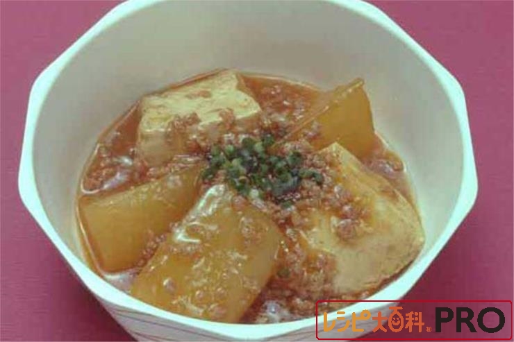 大根とBを合わせて火にかけ、しばらく煮て、(1)を加え、焼き豆腐を入れて煮含め、Cでトロミをつけ、しょうが汁をふる。