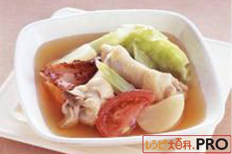 (1)に、ベーコン、キャベツ、しめじ、トマト、長ねぎの順に加え、火が通ったら順に取り出す。