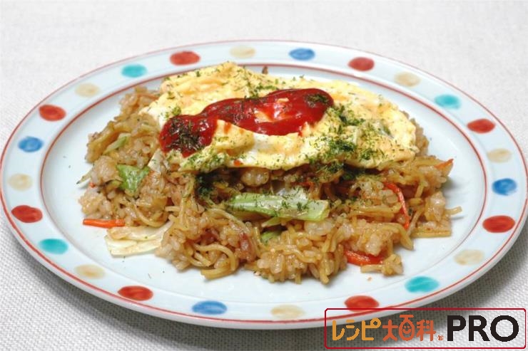 フライパンにサラダ油30gを熱し、Aを順に炒め、塩、こしょうで調味し、ご飯とめんを加えて切るように炒め合わせ、お好みソース、「味の素S」を加える。