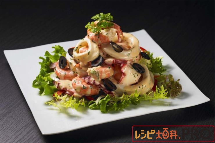 (3)を皿に盛りつけオリーブ、パセリを散らす。