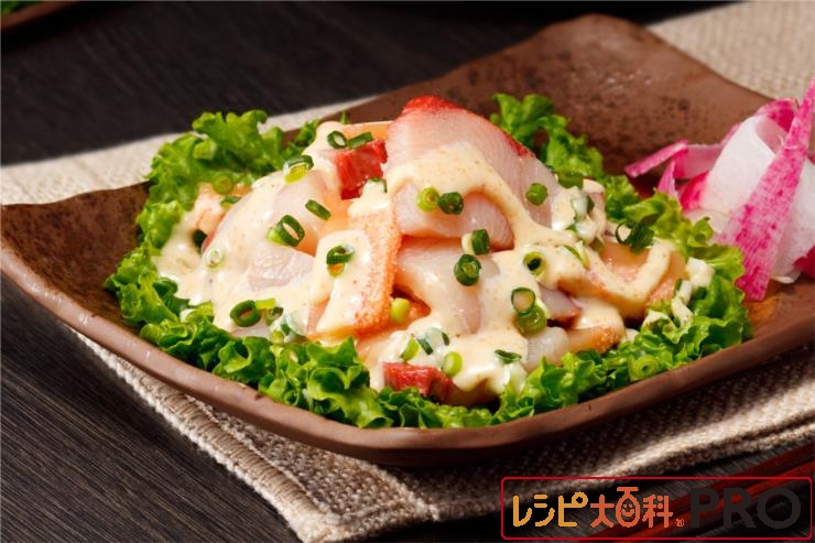 器にグリーンカールを敷き、ぶりと(1)を盛り、小ネギを散らし、(2)を添え、「セミセパ」すりおろし玉ねぎをかける。