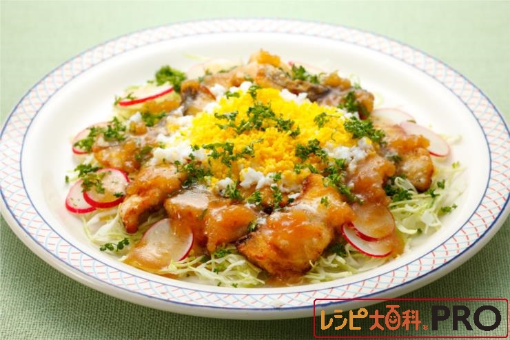 器にキャベツとラディッシュを盛り、(2)を載せてAをかけ、パセリをかけ、「セミセパ」すりおろし玉ねぎをかける。