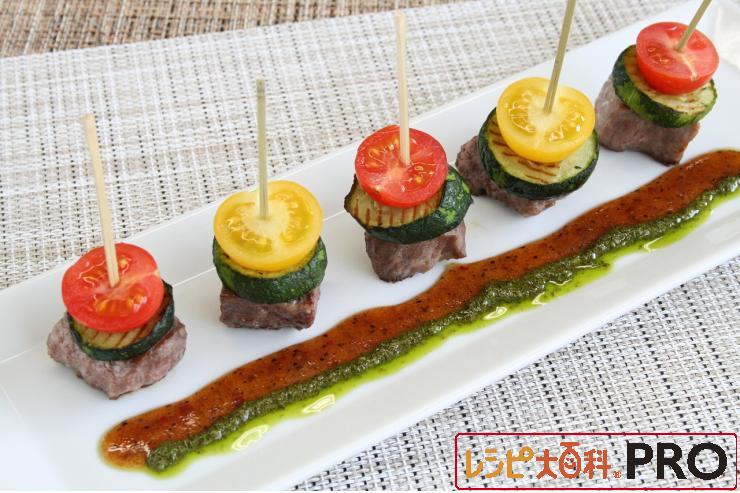 夏野菜とステーキのピンチョス スパイシーバジルソース