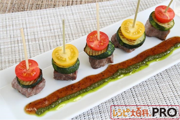 夏野菜とステーキのピンチョス スパイシーバジルソース