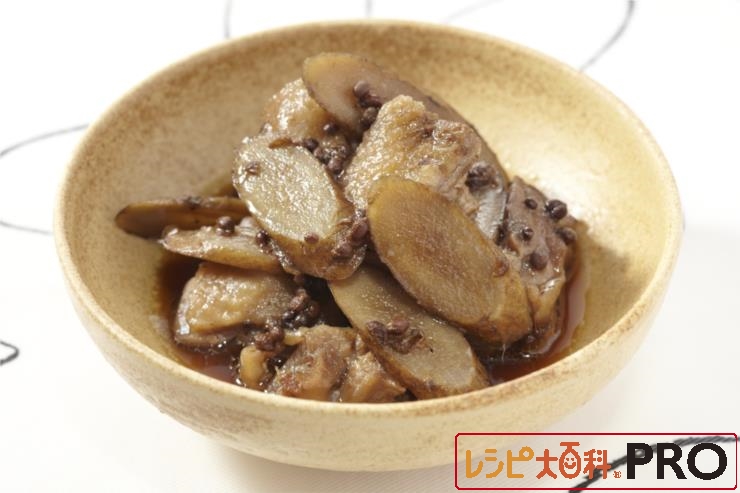 (2)に半量のしょうゆを入れ、落し蓋をし弱火で煮