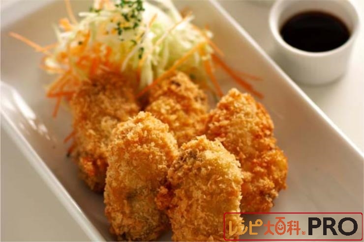 キッチンペーパーで(1)の水気をとり、打ち粉 、溶き卵 、パン粉 の順につけ、180℃に熱した油で、キツネ色になるまで揚げる。