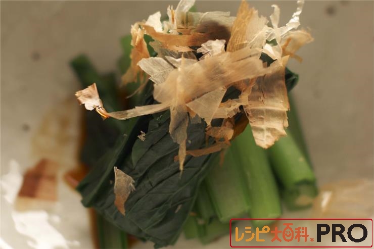 器に(2)を盛り、かつお節、しょうゆをかける。