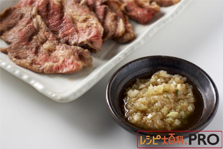 網を熱し、牛焼き肉用肉を焼き、器に盛り、小皿に盛った(1)を添える。