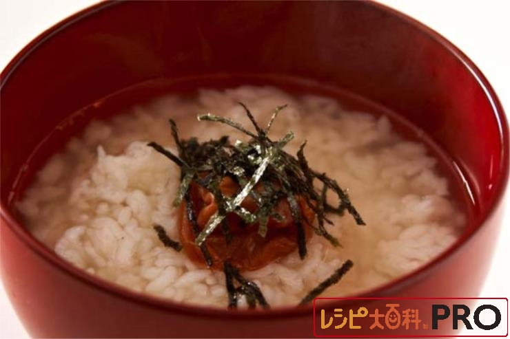茶碗にご飯を盛り、(1)を注ぎ、梅干、のりをのせる。