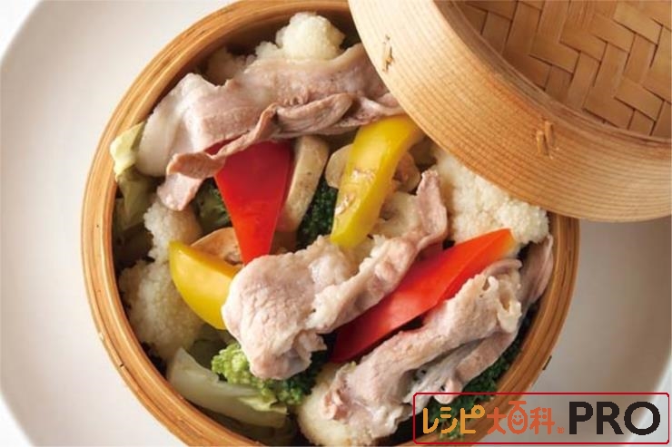 蒸篭にAを敷き、「ほんだしかつおだし」をふりかけ、豚肉をのせて蒸す。