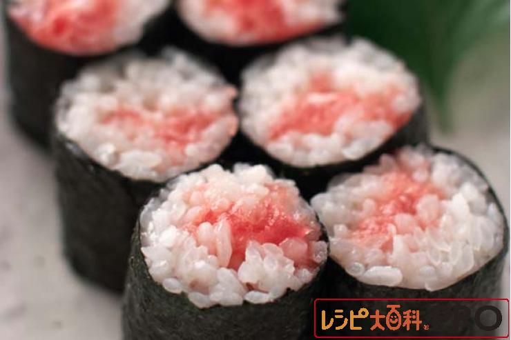 まきすに焼きのりを引き、(2)を引き、まぐろをのせ、巻き上げ、八等分に切り分ける。