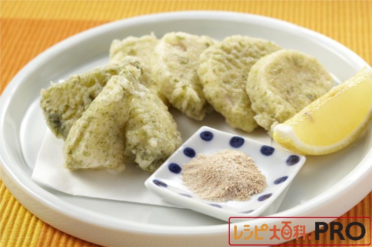 (1)に薄力粉をまぶし、(2)をからめ170℃の揚げ油で揚げる。