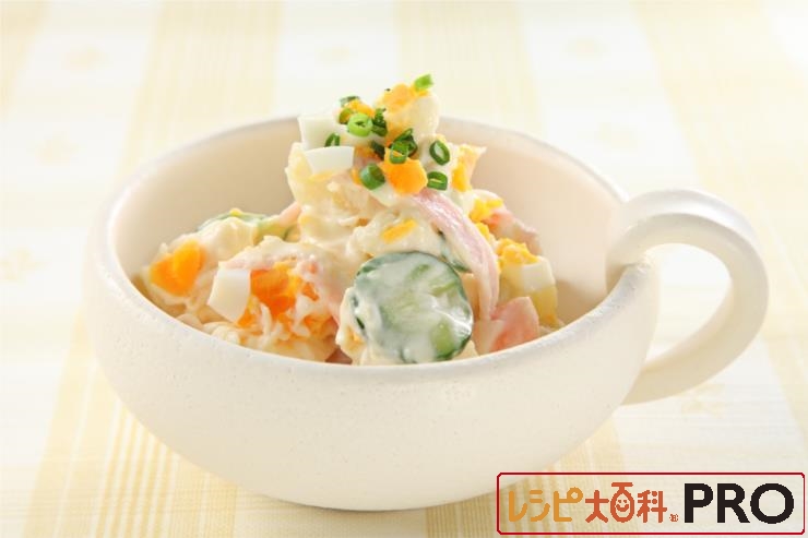 最後にゆでたまごを混ぜ、器に盛り付け、あさつきを飾る。