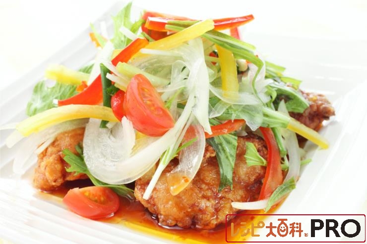 鶏もも肉にAで下味をつけ、Bをまぶし揚げる。