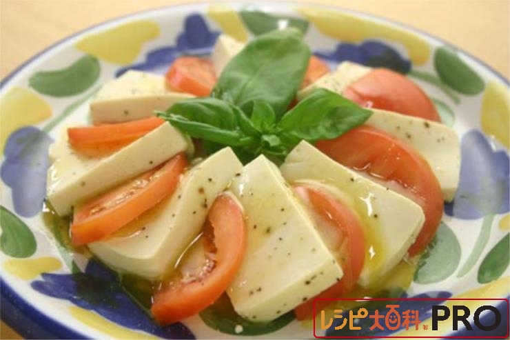 器に(1)、トマト輪切りを盛り、(2)をかけ、バジルを添える。