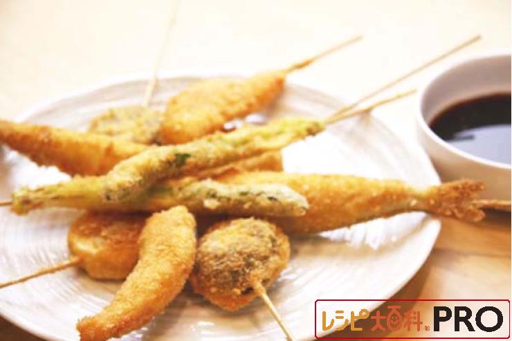(1)、アスパラガス、じゃがいも、しいたけに竹串を刺し、打ち粉、溶き卵、パン粉の順に衣をつける。