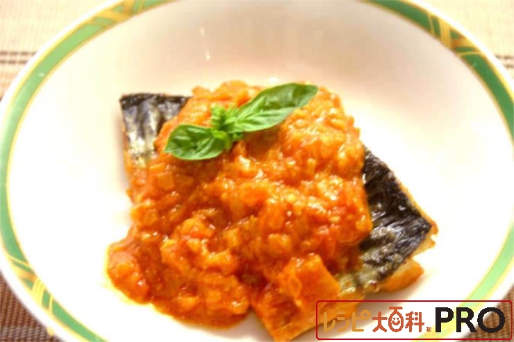 器に(1)を盛り、(4)をかけ、バジルを飾る。