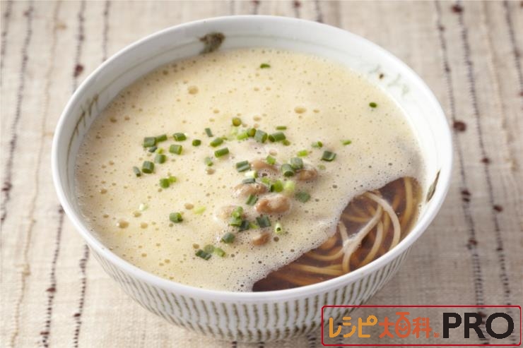 器にそばを盛りつけ、(2)を注ぎ、(1)をかけ、万能ねぎを散らす。