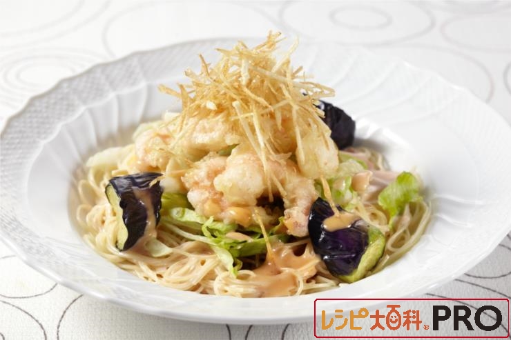器にカペリーニを盛りつけ、レタス、(1)、(2)を盛り、