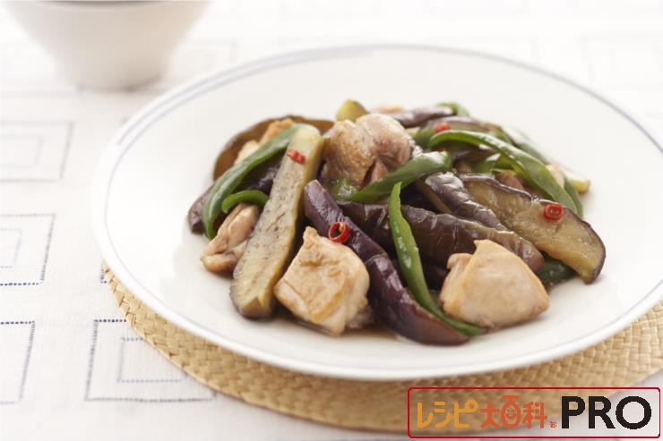 フライパンに油12gを熱し、鶏肉を皮目から入れてこんがり焼き色をつける。キッチンペーパーでなすの水気を拭き取って加え、油12gを回しかけてしっかり炒める。