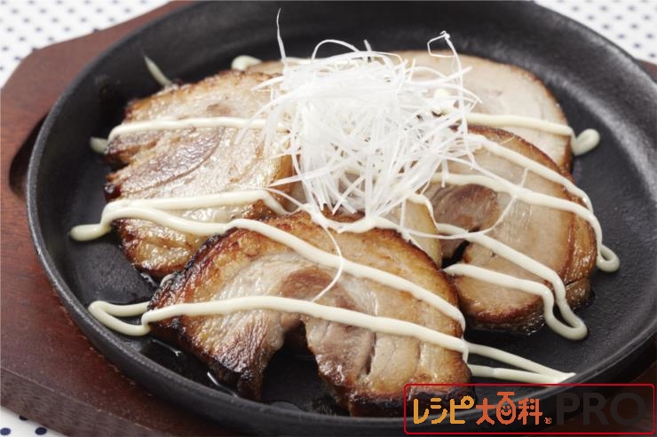 熱した鉄板に(5)を盛りつけ、「ピュアセレクトマヨネーズケータリング1Kgチューブ」を線がけし、白髪ねぎをの